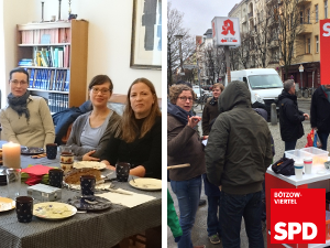 Zuvor standen wir mit dem Abgeordneten Tino Schopf wie jeden dritten Samstag an der Ecke Bötzowstraße / Pasteurstraße an der Seite des Wochenmarktes um über die ungleiche Bezahlung zwischen Männern und Frauen aufzuklären. Der 18. März markierte in diesem Jahr den Tag, bis zu den Frauen theoretisch kostenlos arbeiten. Wir haben den Equal Pay Day genutzt um die Bewohner des Bötzowviertels abstimmen zu lassen. Sollte der Staat die Gleichbezahlung von Männern und Frauen gesetzlich regeln? Das war unsere große Frage.